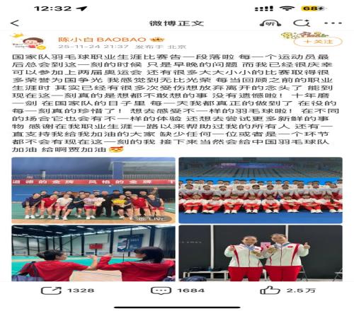 博文中,陈清晨坦言,自己的国家队羽毛球职业生涯比赛告一段落了,能参加两届奥运会、斩获无数荣誉为国争光,感到无比光荣。十年里,她珍惜在役的每一刻,已经没有遗憾。如今,她想要感受不一样的羽毛球,尝试更多新鲜事物。