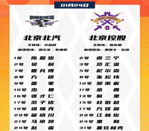 北京:曾凡博20分8板2助2断、杰曼19分4板6助2断、雷蒙15分4板3助、马帝昂7分4板1助、陈盈骏7分2板6助2断、方硕4分4板2助。北控:邹雨宸21分15板2帽、廖三宁21分6板2助2断、里勒14分3板10助、佩里11分7板3助、基兹林克7分2板2助、朱松玮6分。