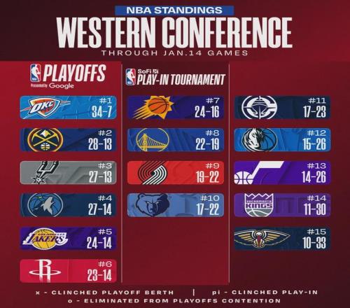 北京时间1月15日,NBA常规赛,独行侠主场109-118不敌掘金。此役过后,掘金28胜13负升至西部第二,把马刺挤到西部第三。约基奇本赛季缺席9场,掘金取得6胜3负。独行侠15胜26负西部第12,领先第13爵士只有0.5个胜场。